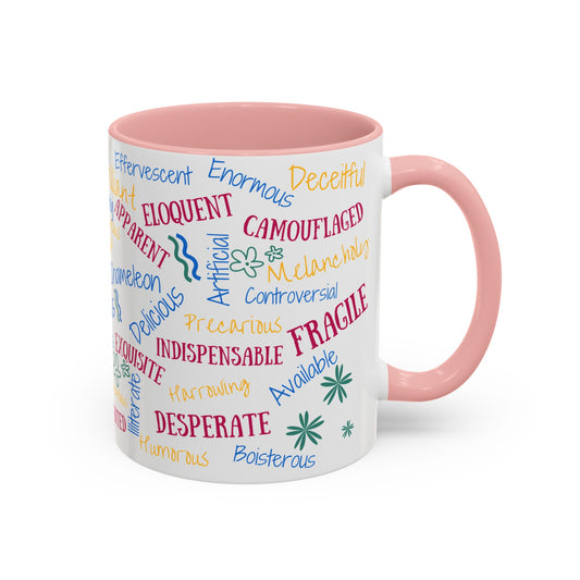 50 English Adjectives Learning Coffee Mug (11, 15oz), English vocabulary and spelling learning.